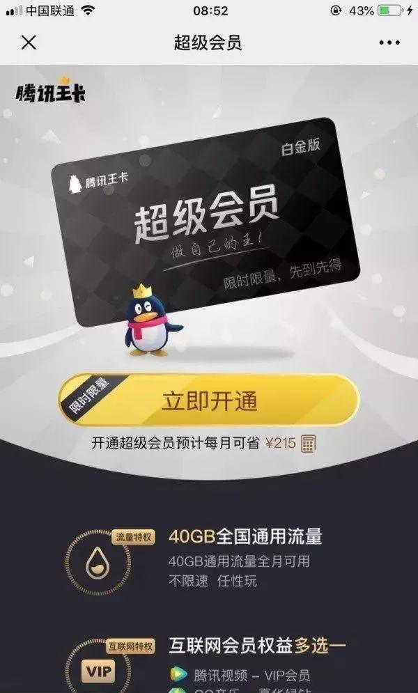 不仅是微信卡。前段时间,中国联通致电部分高流量腾讯王卡用户,邀请开通腾讯王卡超级会员黄金版服务。现在,腾讯王卡超级会员近期已经上线,具体是腾讯王卡超级会员黄金版(资费是30元/月)、超级会员白金版(资费是50元/月)。