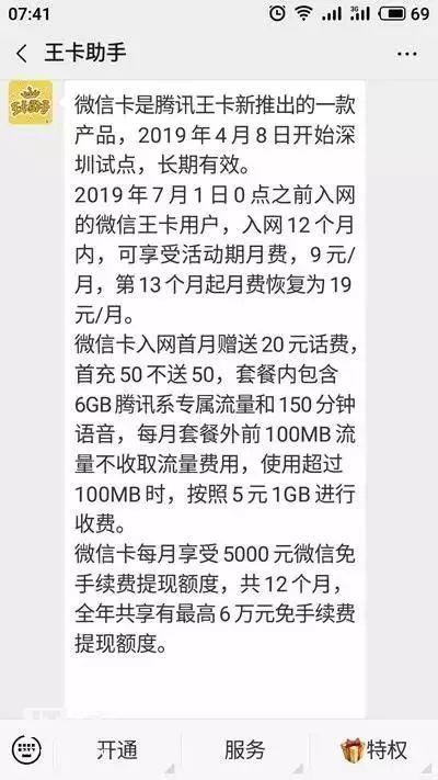 简单来说,这个微信卡是手机卡,也是腾讯大王卡的一种,套餐内包含了定向流量和语音通话等常规内容。2019年7月1日0点之前入网的微信王卡用户,入网12个月内,可享受活动期月费,9元/月,第13个月起月费恢复为19元/月。